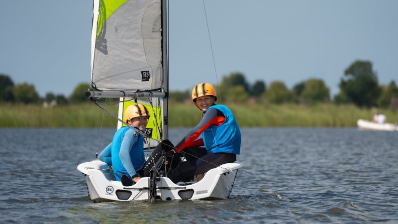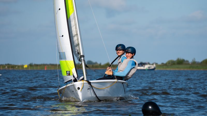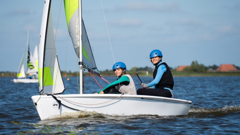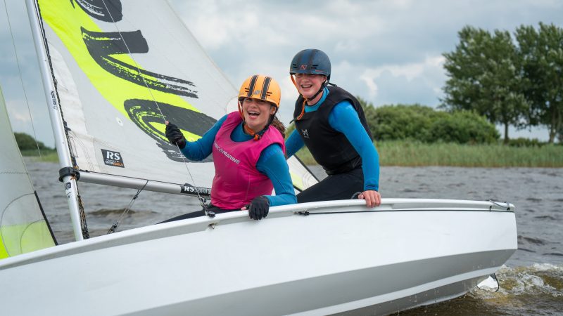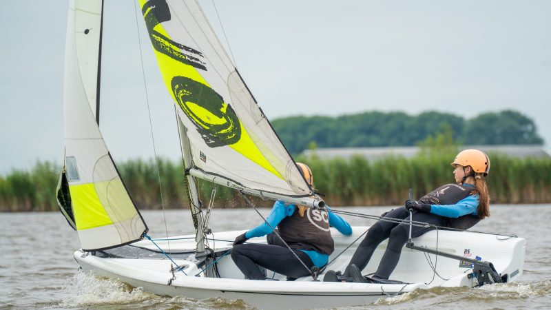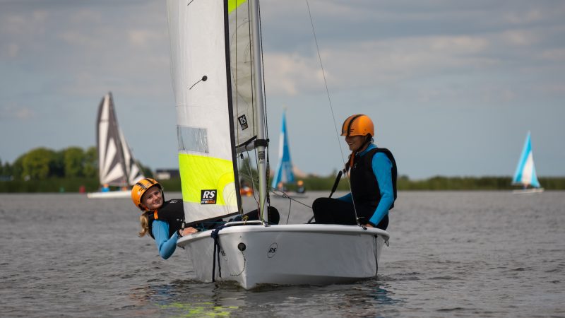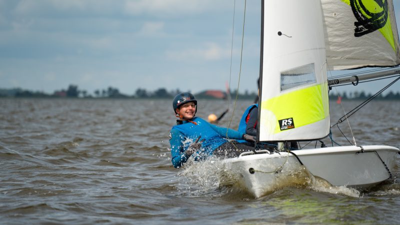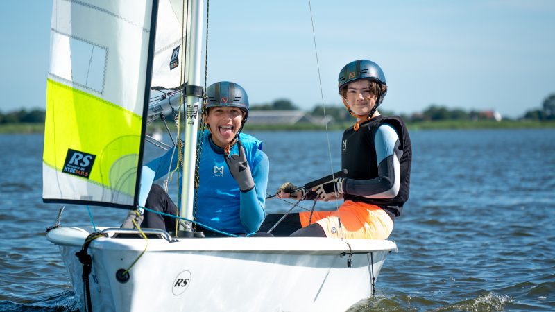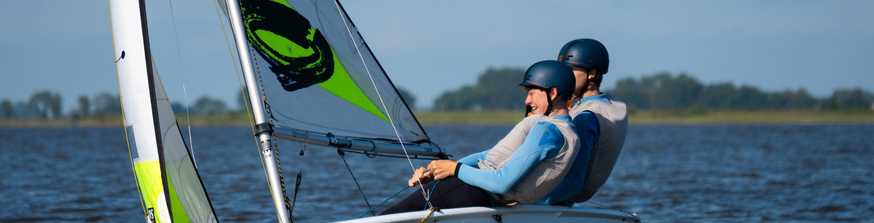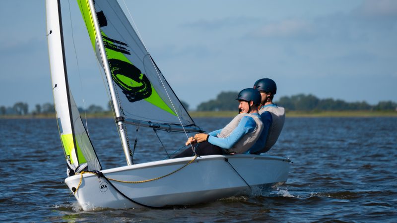 Tijdens het zeilen in de RS Feva draag je een wetsuit, helm, waterschoenen en zeilhandschoenen, zodat je goed beschermd bent en je volledig kunt focussen op snelheid en techniek. De boot valt binnen het diploma Tweemans Jeugdzeilen, waarmee cursisten werken aan alle belangrijke vaardigheden die horen bij het varen met twee personen.